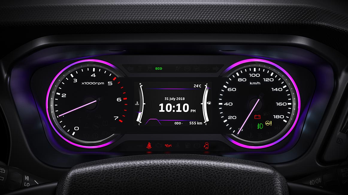 A futuristic purple themed cluster with 3D light guides and animated colour screen.